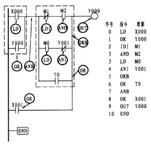 由上圖可以看出,第一支路X003的常開觸點與M1的常開觸點成串聯關系(在這樣的情況下,形成了塊的關系),它是與上一行的X000與M0串聯后相并聯,此時程序的編寫,如步序號0、1、2、3、4所示。4所出現的第一個ORB指的是與上一行并。而第二支路,常閉Y001與M2同樣是串聯關系。也是一個塊結構,其串聯后再與第一支路并。故步序7再次出現ORB。ORB指令并無梯形圖與數據的顯示。可以這樣認為;它是下一行形成電路塊的情況下與上一行并聯的一條垂直直線(如圖中所示的二條粗線)。